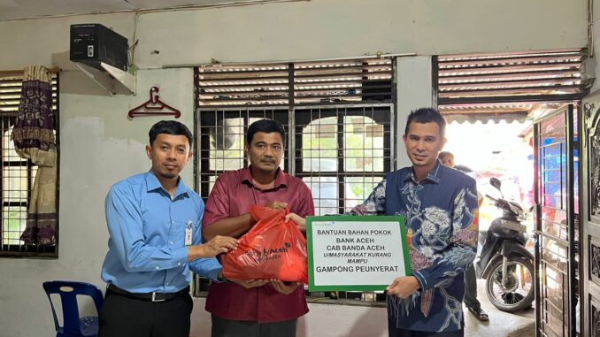 Peunyeurat- PT. Bank Aceh Syariah Cabang Banda Aceh memberikan 20 paket sembako untuk masyarakat kurang mampu (27/4/2022). Bantuan ini diserahkan langsung oleh pemimpin cabang yaitu bapak M. Hendra Supardi kepada Keuchik Gampong Peunyeurat. Pada kesempatan tersebut Keuchik Peunyeurat T. Ismed Fadillah mengucapkan terima kasih kepada Bank Aceh Syariah yang telah memberikan perhatian untuk Warga Peunyeurat terutama dalam menghadapi Hari Raya Idhul Fitri dimana perekonomian masih belum stabil. Dengan adanya bantuan ini sangat membantu sekali warga peunyeurat. Bantuan sembako diantar oleh Keuchik Gampong Peunyeurat kerumah-rumah warga yang kurang mampu. Salah satu warga peunyeurat menyampaikan rasa terima kasih atas bantuan ini.