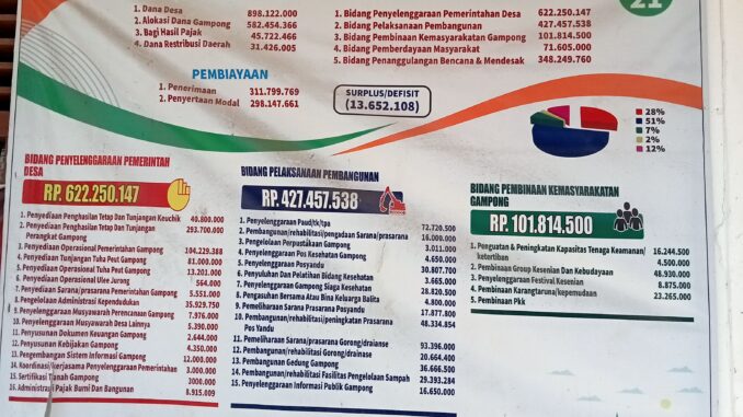 Laporan anggaran dana gampong diatas bersifat informasi. Detil dan kebenaran data diatas akan selalu diperbaharui sesuai dengan dokumen resmi anggaran dana gampong pada tahun yang bersangkutan.