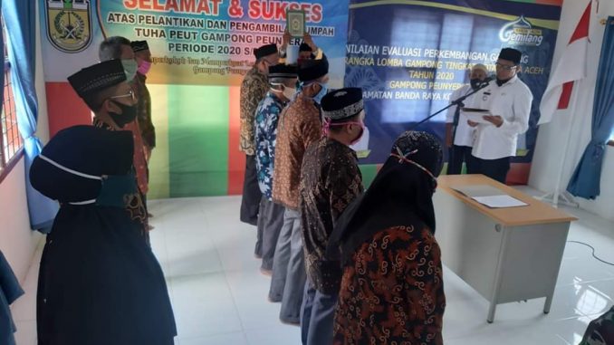 BANDA ACEH—Wali Kota Banda Aceh yang diwakili oleh Camat Banda Raya, Faidian Faisal SSTP MSi, melantik dan mengambil sumpah pengurus TPG Peunyerat Periode 2020-2026, Rabu (13/5/2020) siang di lantai 2 aula kantor keuchik setempat.